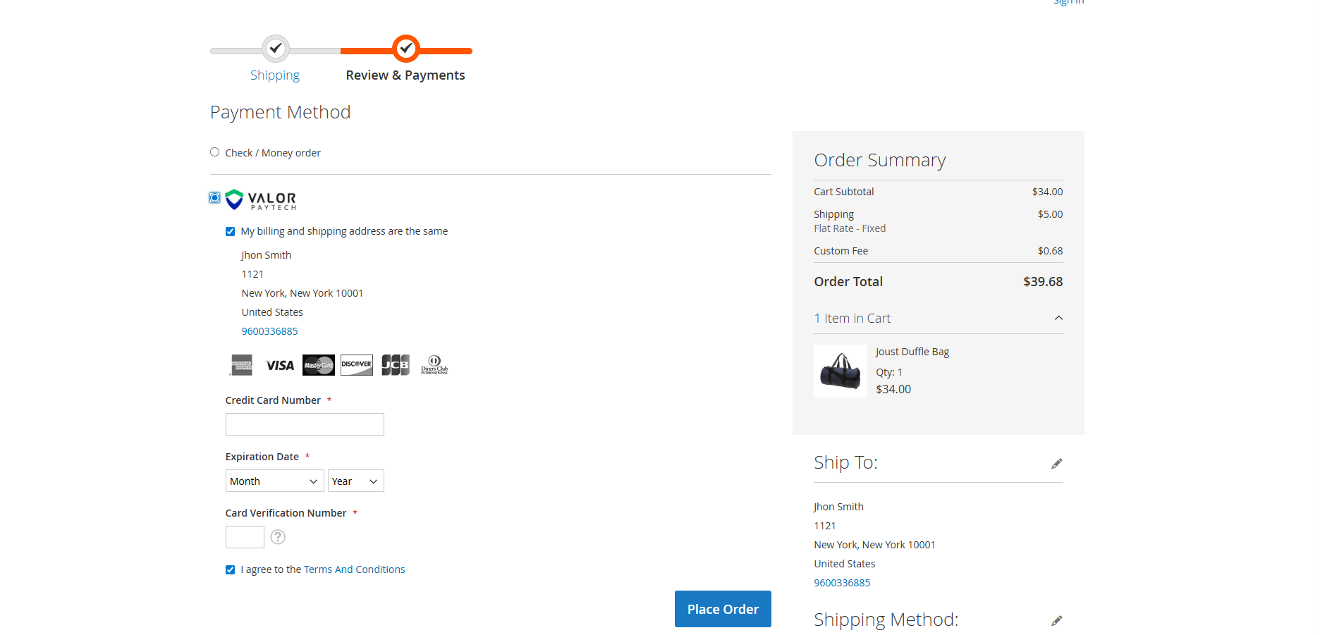 Once the extension is configured, it can be seen enabled in the frontend. Simply add products to cart and check out, you will see the Valor Payment Gateway method enabled. Select it, enter the card details, and click Place Order to finish payment and place the order successfully.