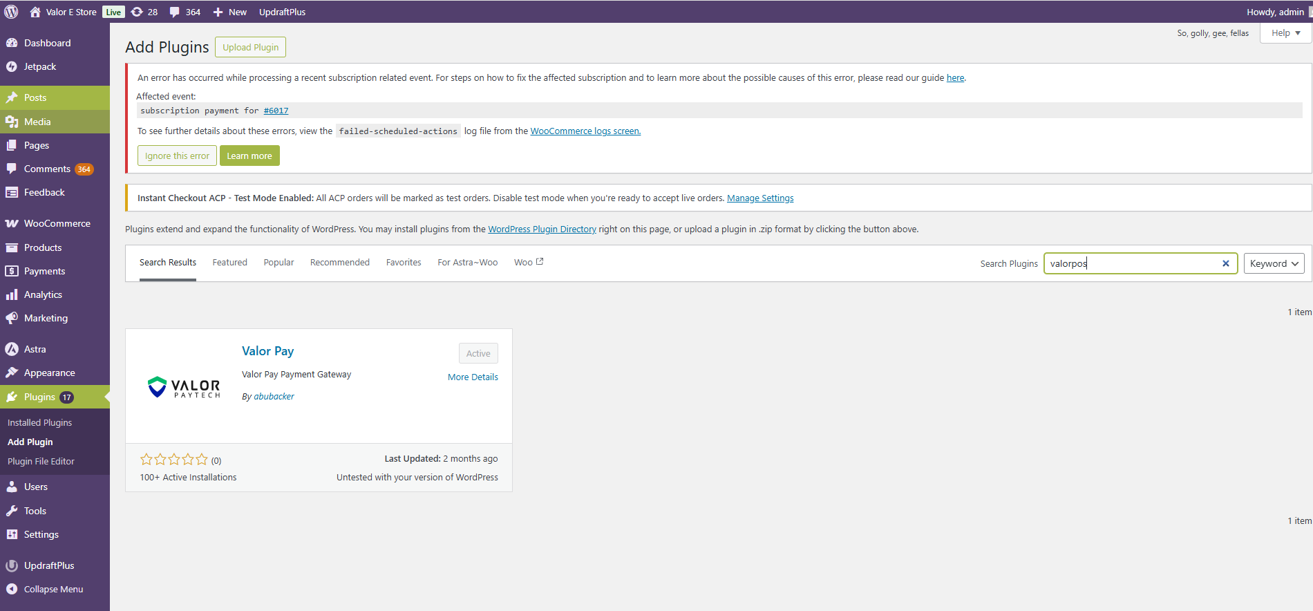 - In the search bar at the top-right corner, type in the name plugin “valor pay”.